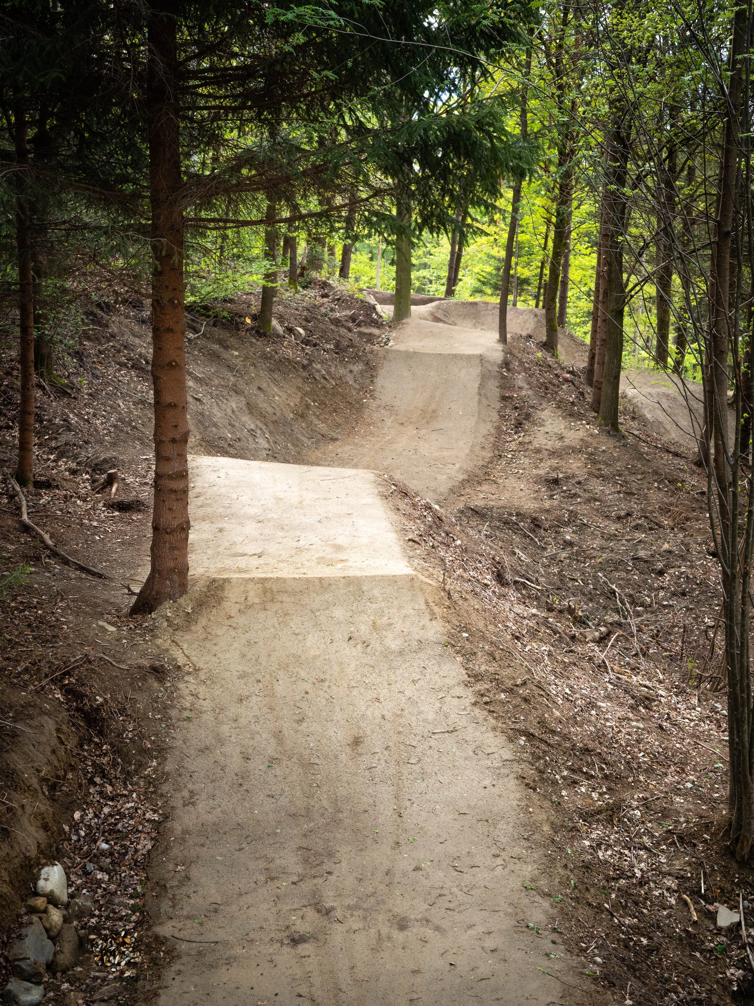 The majority of the trails are located in the upper section of the site, just 30 meters above sea level. A modern uphill flow trail, the blue "Kirschen Flowline", the red-classified enduro trail "Kastanien Line" and the heart of the facility: the 272-metre-long "Eichen Jumpline". The latter impresses with sharkfins, tables and creative features that offer experienced riders many playful options.